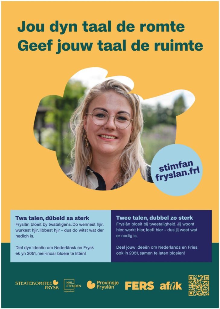 Stim fan Fryslân (Stimfanfryslan.frl) is spesjaal ûntwikkele om boargers mear ynfloed te jaan op it belied fan de provinsje en biedt romte foar ideeën, diskusjes en ynspraak, yn dit gefal oer de takomst fan de Fryske taal en kultuer. Om minsken te wizen op de mooglikheid om mei te praten, wurdt de kampanje ûnder de oandacht brocht fia sosjale media, adfertinsjes en posters. Ek wurde der ambassadeurs ynset en sille der fysike gearkomsten plakfine.