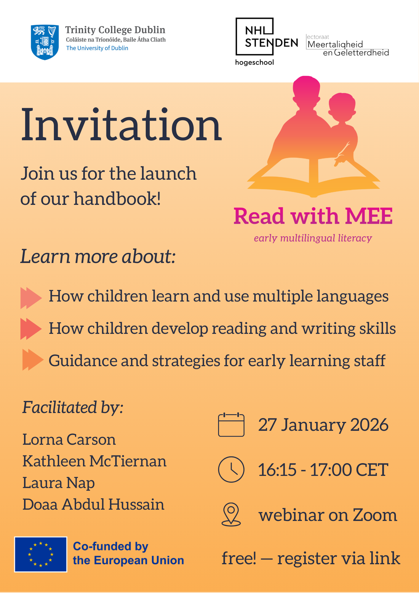 Op tiisdei 27 jannewaris 2026 is elkenien, online, fan herte wolkom om it Ingelsktalige webinar ta gelegenheid fan de lansearring fan it nije hânboek fan it Read with MEE-projekt by te wenjen. Dat hânboek jout tagong ta nije wurkwizen en resinte ûntwikkelings op it mêd fan taalûntwikkeling, taalkundich ferskaat en ûndersyk nei meartaligens. It hânboek wurdt fergees beskikber makke op de website fan Read with MEE.